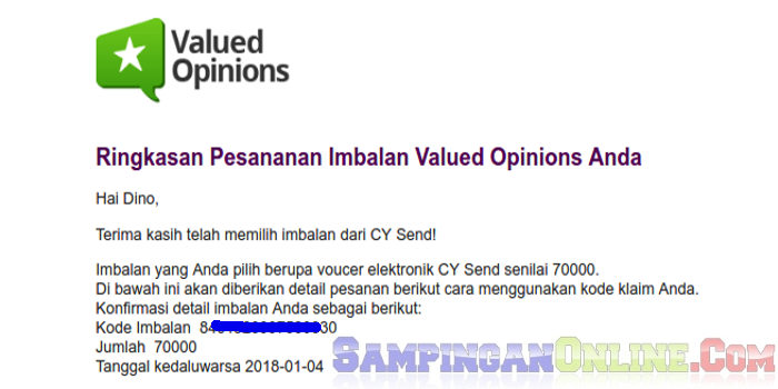 Dan dalam subjek email “Ringkasan Pesananan Imbalan Valued Opinions Anda” yang dikirimkan oleh [email protected] tersebut akan disertakan kode imbalan beserta tanggal kadaluarsanya.