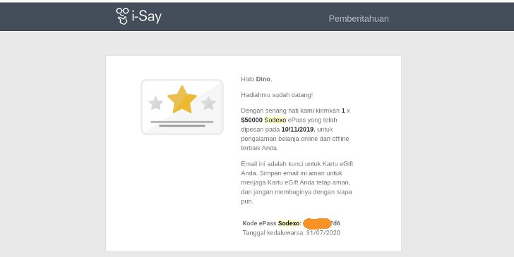 Setelah kamu memiliki paling sedikitnya 840 poin di akun survey online IPSOS iSay, kamu sudah bisa menukarnya dengan e-voucher Sodexo Epass senilai 50 ribu.