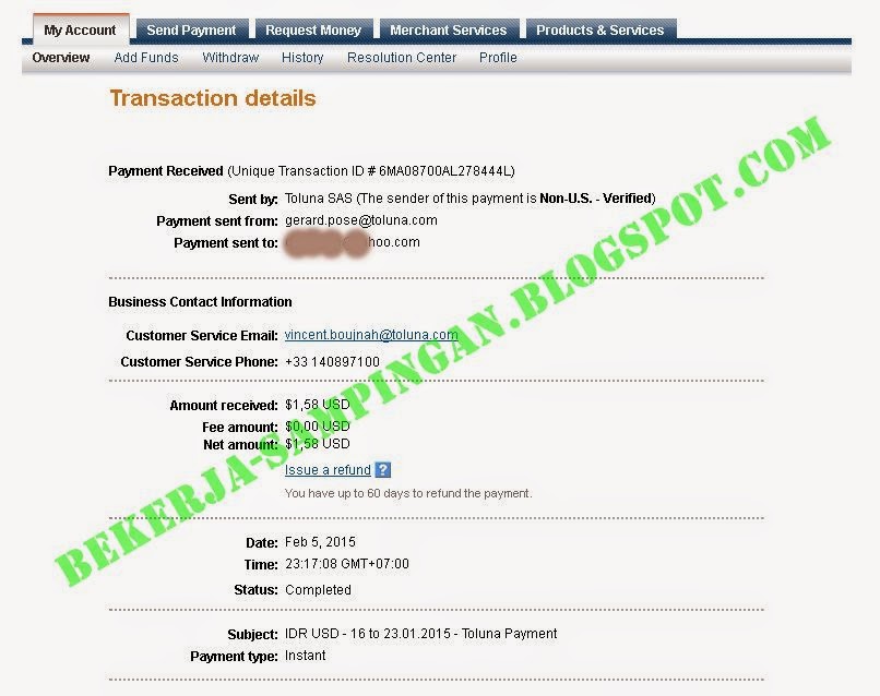 Dan sobat hanya memerlukan waktu beberapa menit saja dalam sehari untuk mengisi materi survey-surveynya. Berikut ini saya coba untuk membuat screenshot dari dari hasil transaksi di rekening paypal saya hasil pencairan poin komisi saya yang di bayarkan oleh toluna kepada saya.