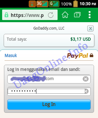 Disamping ini adalah screeshot sewaktu saya checkout di GoDaddy.Com pada saat membeli domain untuk blog ini "www.uangonline.info" (sekarang udah ganti menjadi www.sampinganonline.com) dengan menggunakan metode pembayaran paypal.