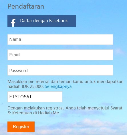 Jadi tunggu apalagi, sekarang saatnya anda mendaftar di Hadiah.Me dengan GRATIS tanpa biaya apapun klik disini untuk mendaftar. Lalu akan muncul tampilan seperti dibawah ini: