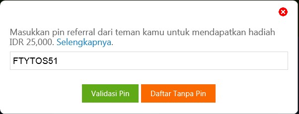 Agar lebih mudah, silahkan anda klik Daftar dengan Facebook dan pastikan pin pada kolom masukkan pin refferal adalah FTYTOS51 jika belum silahkan anda ganti menjadi FTYTOS51 saja agar anda mendapatkan hadiah 25rb.