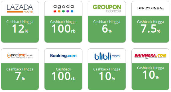 Sedangkan untuk kategori produk-produk Travel diantaranya: Agoda cashback hingga 100rb, AirAsiaGo.Com cashback hingga 8%, Pegipegi.com cashback hingga 7%, Wego cashback hingga 5%.