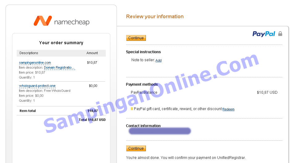 Akan tetapi saya tidak membelinya di Godaddy.Com melainkan di NameCheap.Com. Dan ternyata harga domain di website penjual nama domain tersebut cukup murah dan menyediakan metode pembayaran dengan rekening paypal juga.