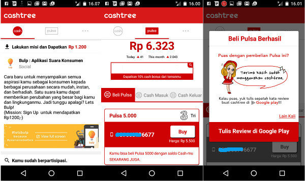 Seperti pada gambar hasil dari screenshot layar hp saya diatas, ketika jumlah cash kita sudah mencapai sedikitnya 5.500 rupiah, maka kita melakukan pembelian pulsa menggunakan cash yang sudah kita peroleh secara gratis itu. Mengenai harga pulsanya adalah 5.500, untuk pulsa 5000, 11.000 untuk pulsa 10.000, 20.000 untuk pulsa seharga 22.000, dan yang terakhir 55.000 untuk pulsa 50 ribu rupiah. Saya tidak tahu apakah harga tersebut untuk pulsa xl dan axis, telkomsel, dan indosat, ataukah hanya untuk operator 3 saja. Karena kebetulan nomer hp yang saya pergunakan sebagai penerima pulsanya adalah nomer tri.