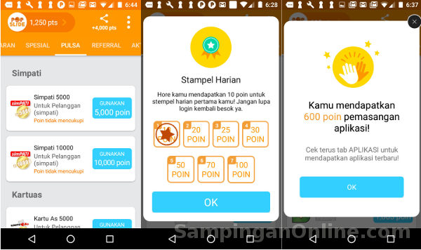 Stampel harian adalah hadiah poin yang akan diberikan untuk setiap pengguna yang masih memasang dan membuka aplikasi PopSlide di HP Android mereka. Dan untuk saat ini hanya akan diberikan selama 7 hari dengan perhitungan 10 poin dihari pertama, 20 dihari ke-2, 25 dihari ke-3, 30 dihari ke-4, 50 dihari ke-5, 70 dihari ke-6, dan 100 dihari ke-7