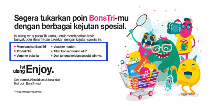 Untuk layanan dari Tri sendiri, bisa ditukarkan dengan layanan Ring Back Tone (RBT) dan tiket nonton konser musik Sound of 3.