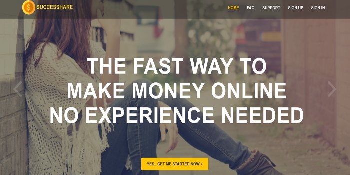 Ada satu lagi sebuah website SuccesShare.com yang menawarkan bayaran cukup tinggi untuk setiap membernya. Bahkan dalam deskripsi websitenya tertulis metode baru untuk mendapatkan lebih dari $100 dollar dalam sehari.Jika memang yang SuccesShare janjikan adalah benar, tentu akan semakin banyak lagi orang kaya di dunia ini yang memiliki penghasilan hingga 40 jutaan sebulan. Baca juga: Jenis Penipuan Online Terbaru.