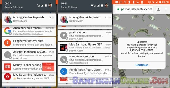Bagaimana tidak menggangu, karena setelah pengunjung mengklik Allow to continue yang berarti menyatakan bersedia untuk menerima pemberitahuan iklan, maka dalam waktu yang tidak lama notifikasi iklan-iklan akan bermunculan di layar hp.