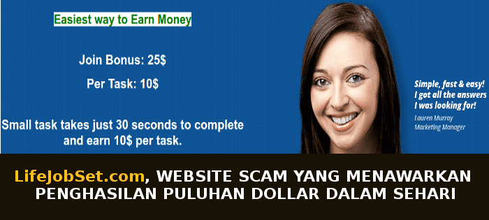 Dan sekali lagi, bahwa program dari lifejobset.com ini merupakan 100% program scam alias penipuan konyol. Karena siapa yang mau untuk membayar 10$ hanya dengan menerima klik dan kunjungan saja, dan apa keuntungannya bagi yang membayarnnya.