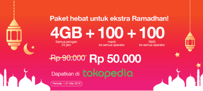 Ada promo spesial edisi menjelang bulan Ramadhan tahun ini yang diselenggarakan oleh Provider Tri dan Tokopedia, yakni promo Hot Sale Mix Combo 4GB + 100 Menit + 100 SMS ke semua operator. Jika harga sebelum promo adalah 90 ribu, pada harga promo ini bisa kamu beli dengan 50 ribu saja.